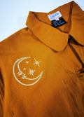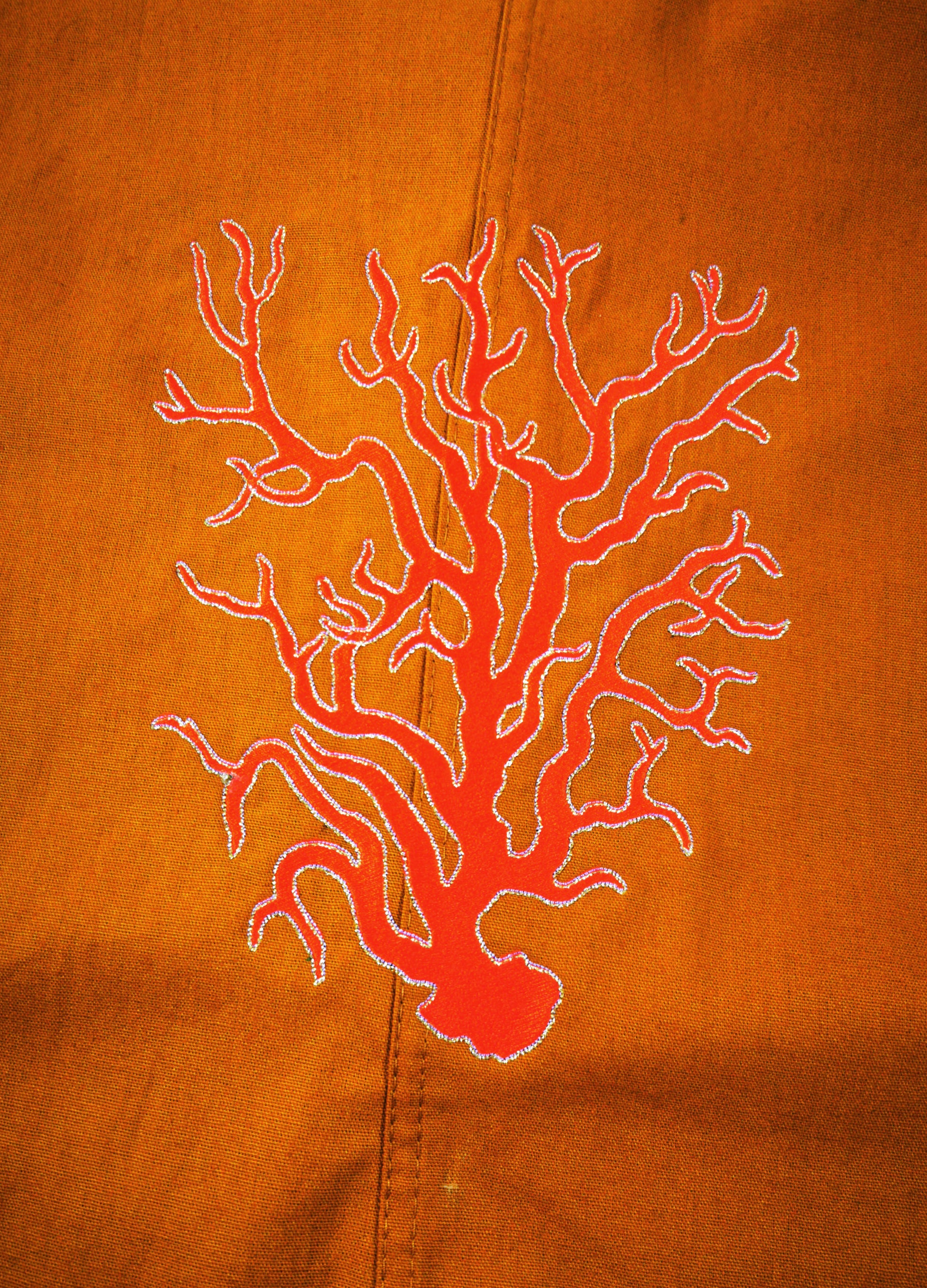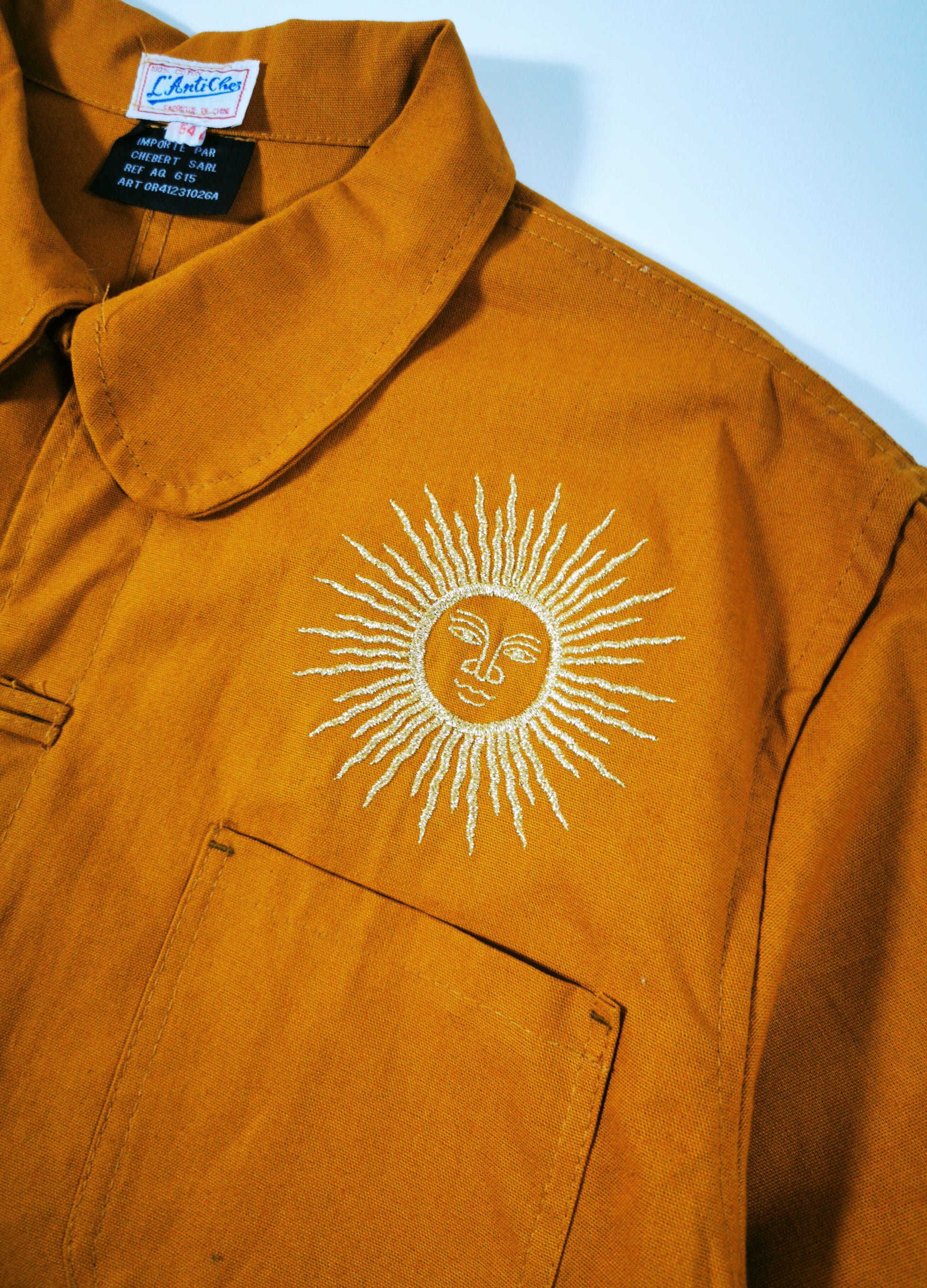C'est une pièce unique vous y retrouverez la lune et le soleil brodés sur le devant en doré ainsi qu'un corail dans le dos entouré d'un léger liserait doré.