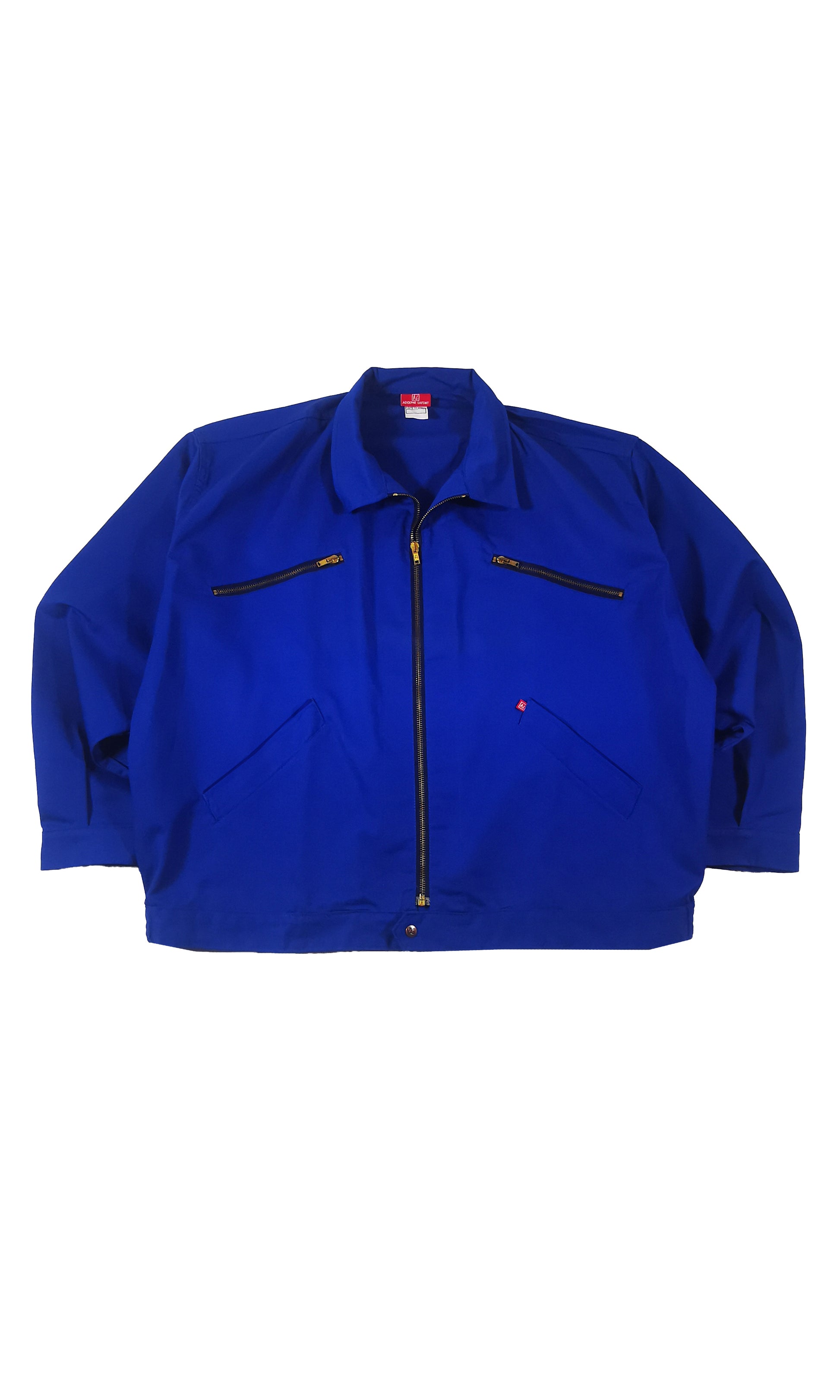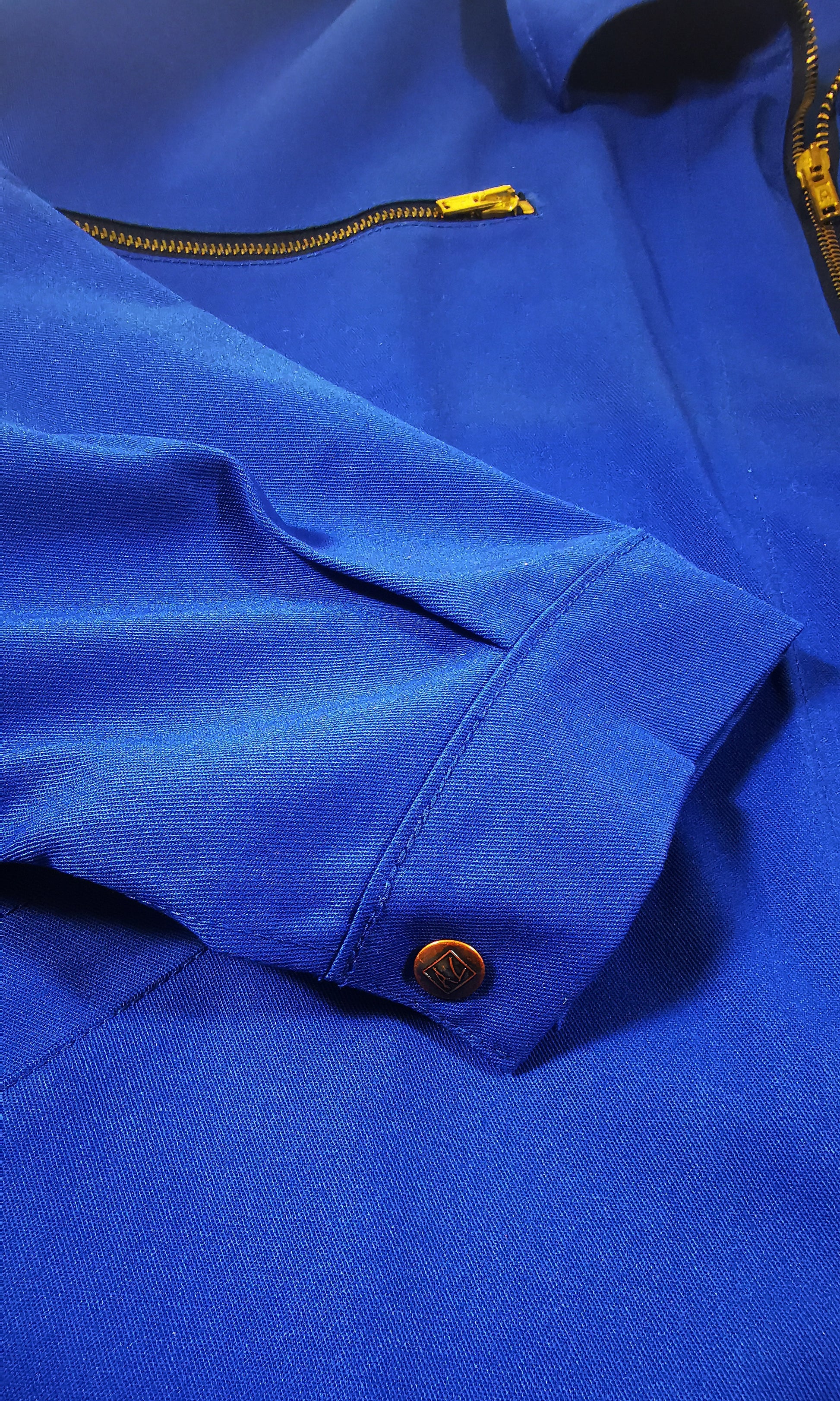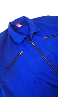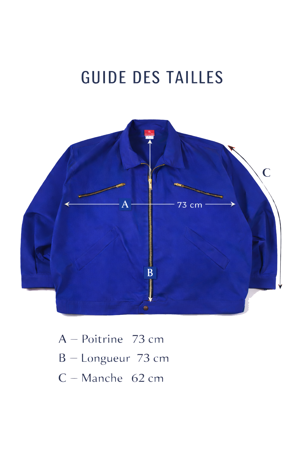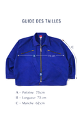 Pièce unique dans notre vestiaire, ce bleu de travail de taille 54, correspondant à un XL, et possède un zip métallisé doré centrale et sur les poches poitrines, des boutons pressions aux manches et en bas de l'encolure. Il y a un élastique sur les hanches qui ressert la silhouette.